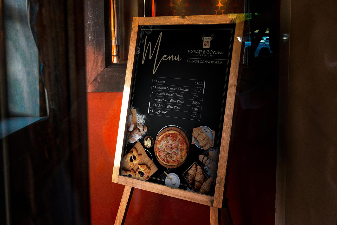Noon Fay Creatives handled the complete branding design for both the shop and website. Noon Fay chose a rich wooden texture for the main signage with the signature Bread and Beyond wheat logo. In keeping with the branding theme colors the exterior of the shop was given a brown textured cement exterior with a protruding flag sign done in black iron with the wheat-colored logo. The menu standee was made with cedar wood.