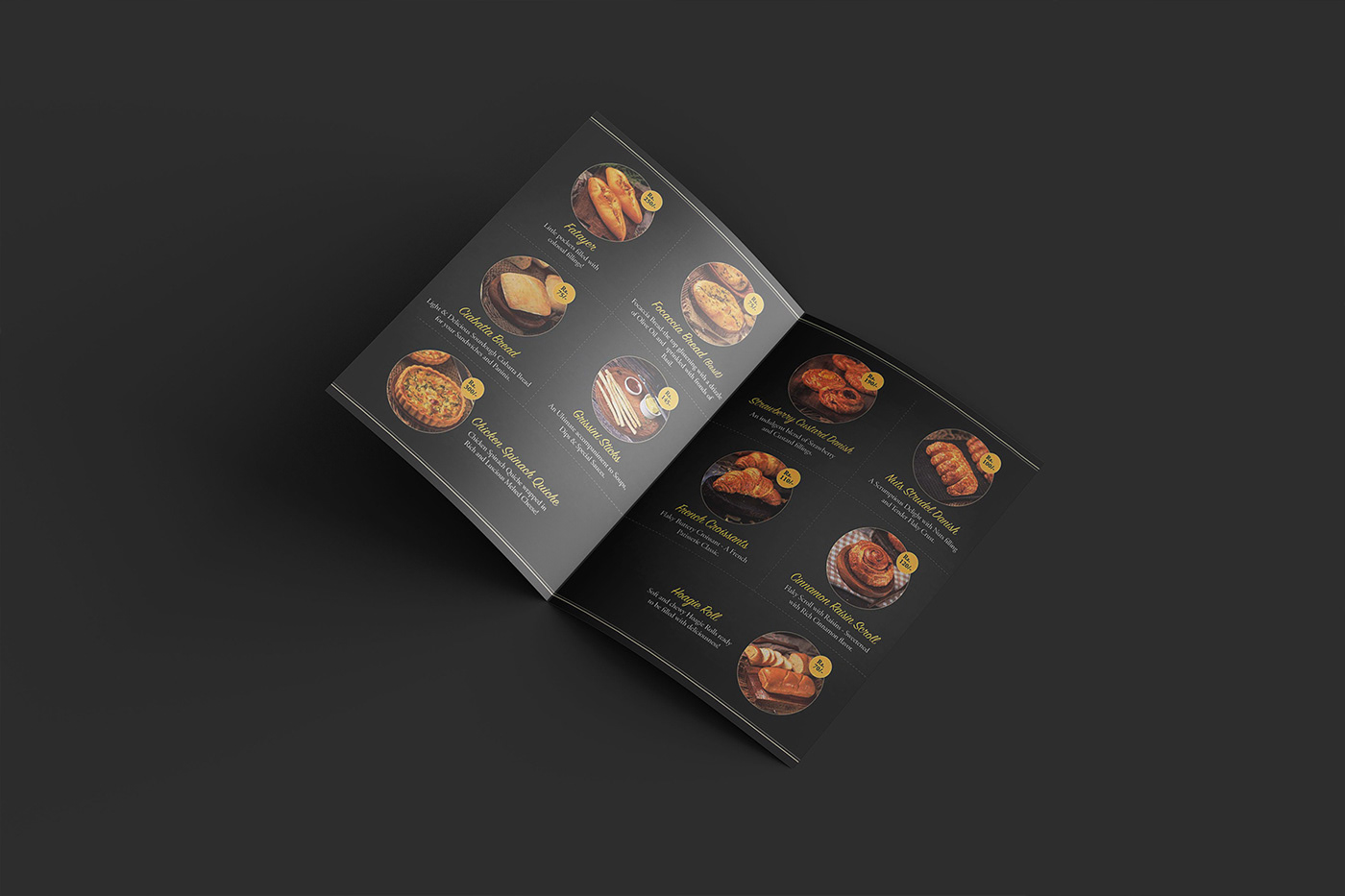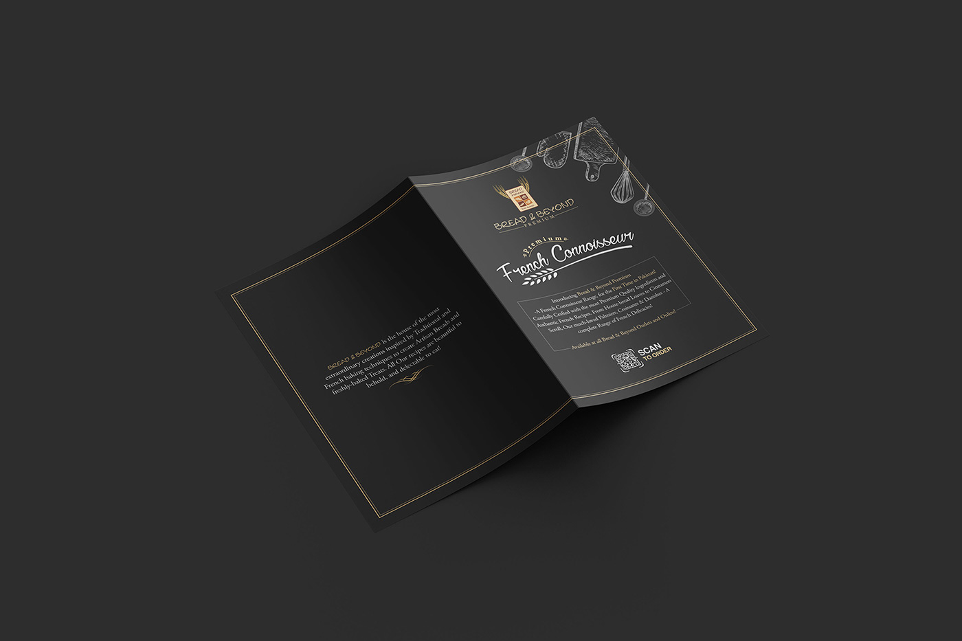 The Menu board was given a black background to better showcase the high-quality images of flour covered rustic bread and wooden cutting boards with delicious baked goods. The counters too used wooden fronts with black marble tops. The marble tops were used to display breads and pastries covered with a glass front and offset by bright low hanging lights. The wall menu boards used a traditional chalk board. Images used on the website and on social media retained the same dark background theme with croissant sandwiches portrayed on dark jute or log boards to retain the rustic feel to indicate the centuries old European baking tradition that Bread and beyond is bringing to Pakistan.