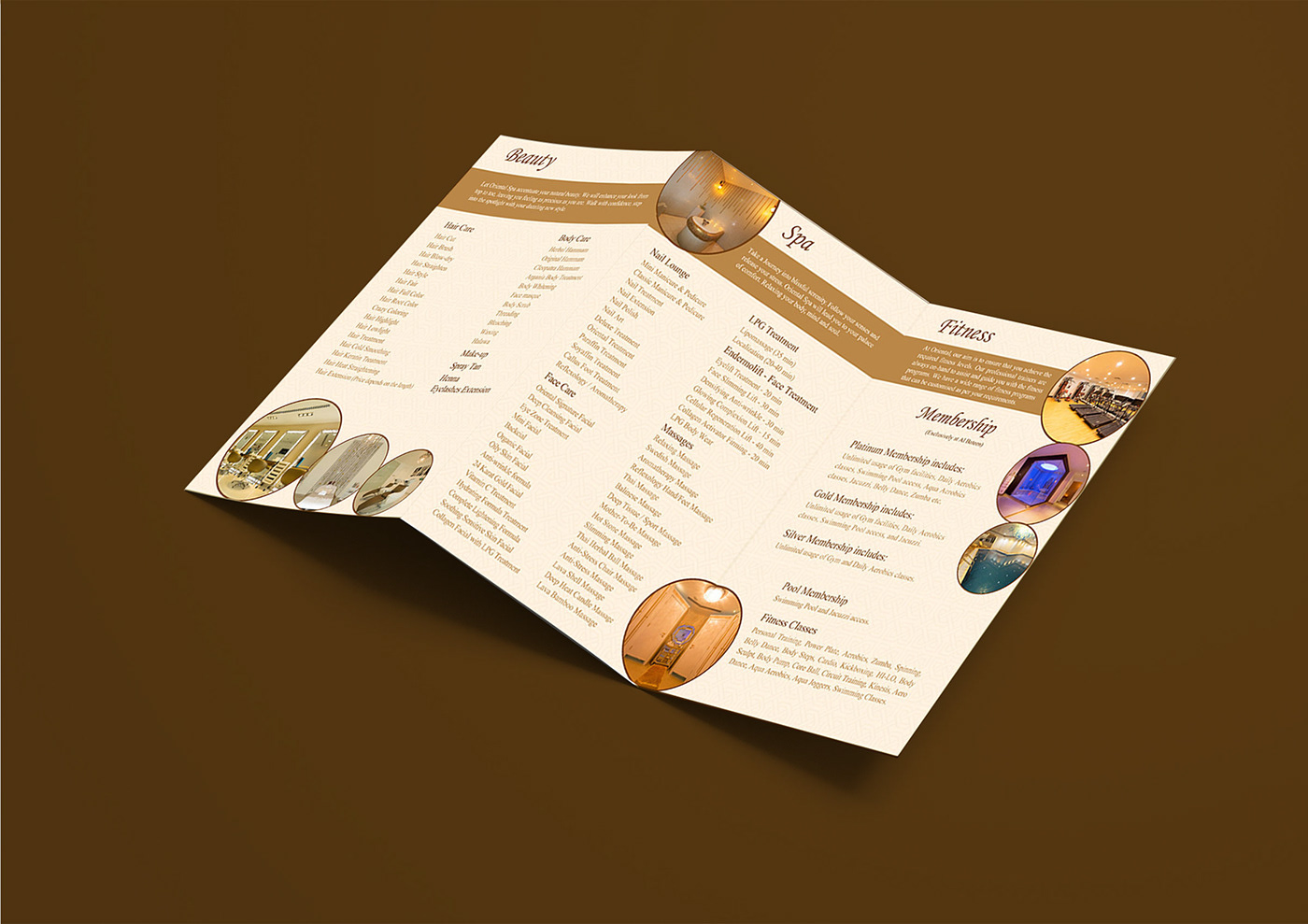 For stationary NoonFay designers chose a luxurious organic handmade paper. The front of the visiting card was an elegant cream with gold brown logo while the back was earthier. Their brochure too was made in the same cream and brown tones advertising their services.