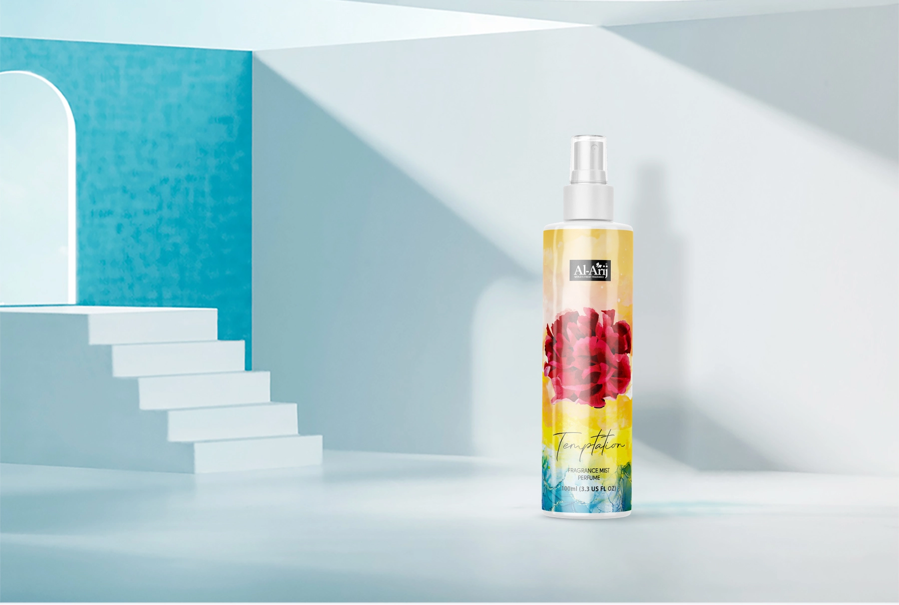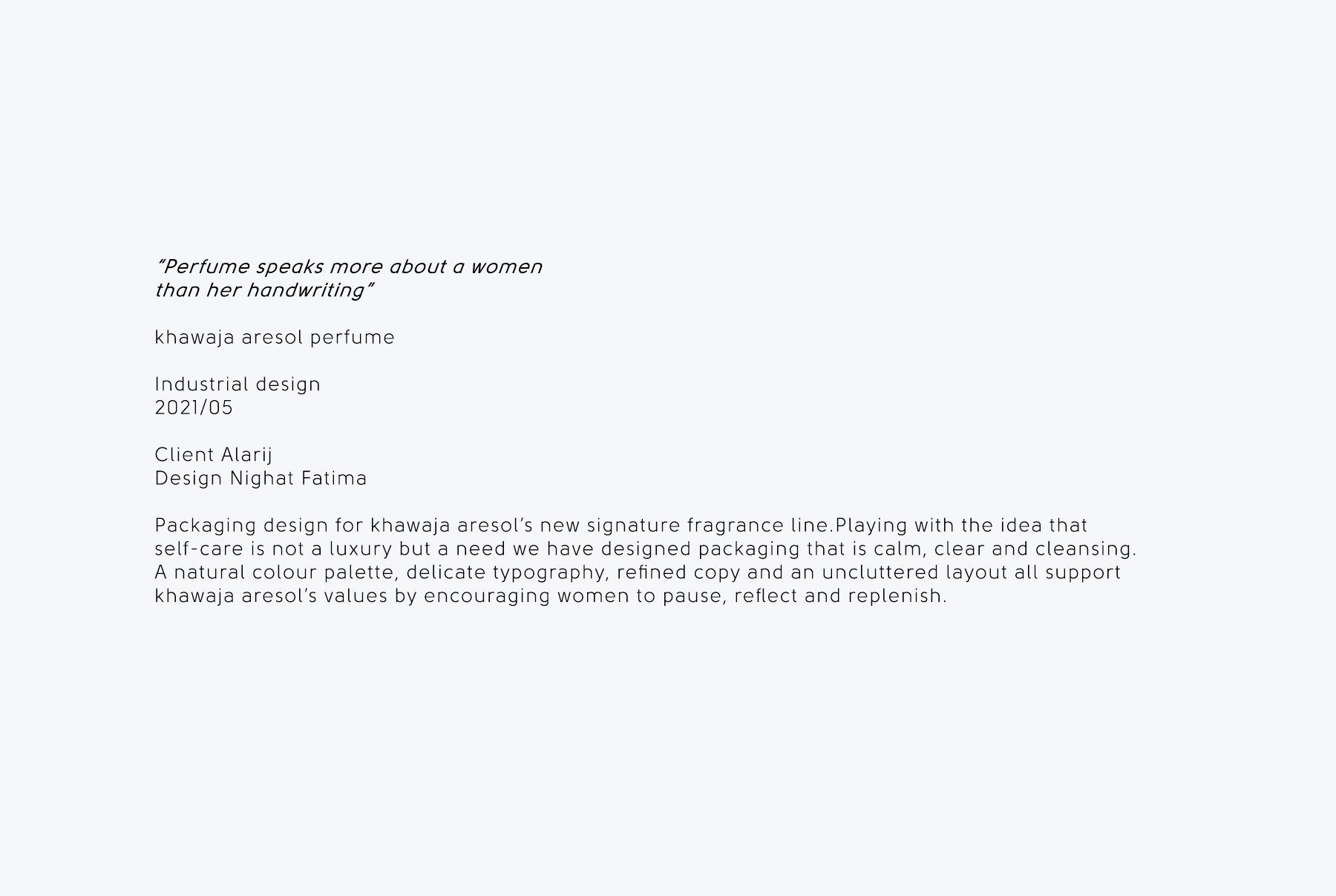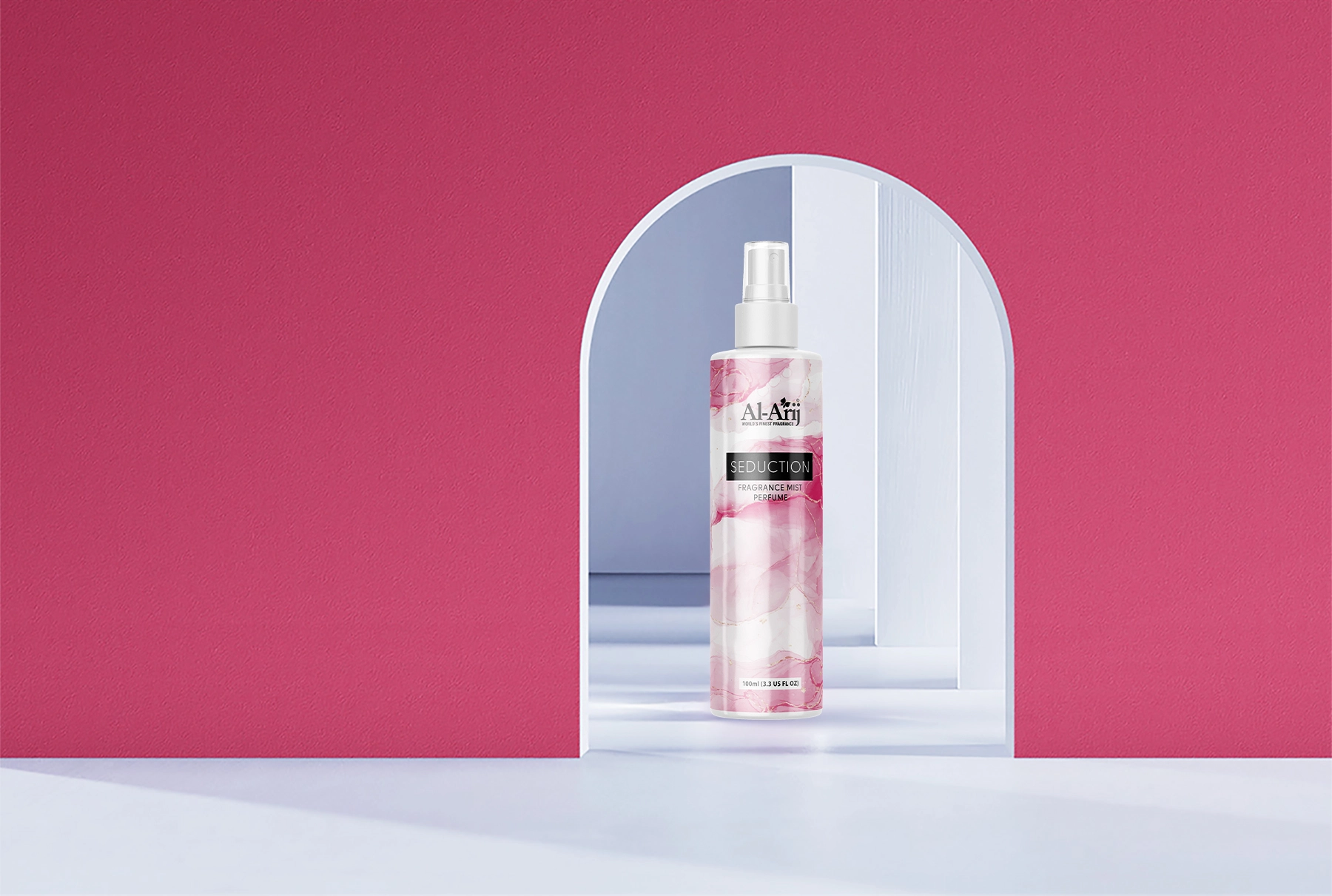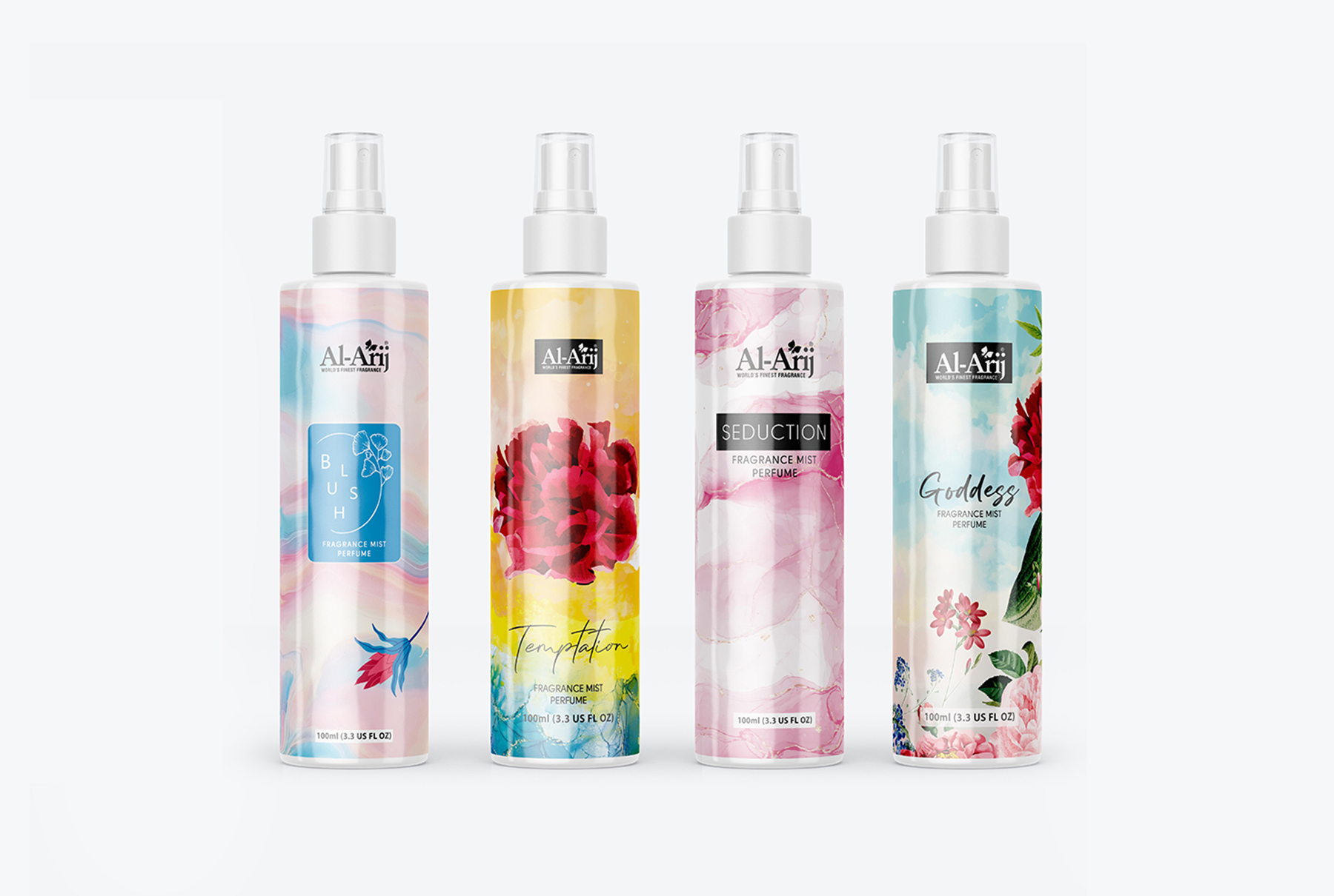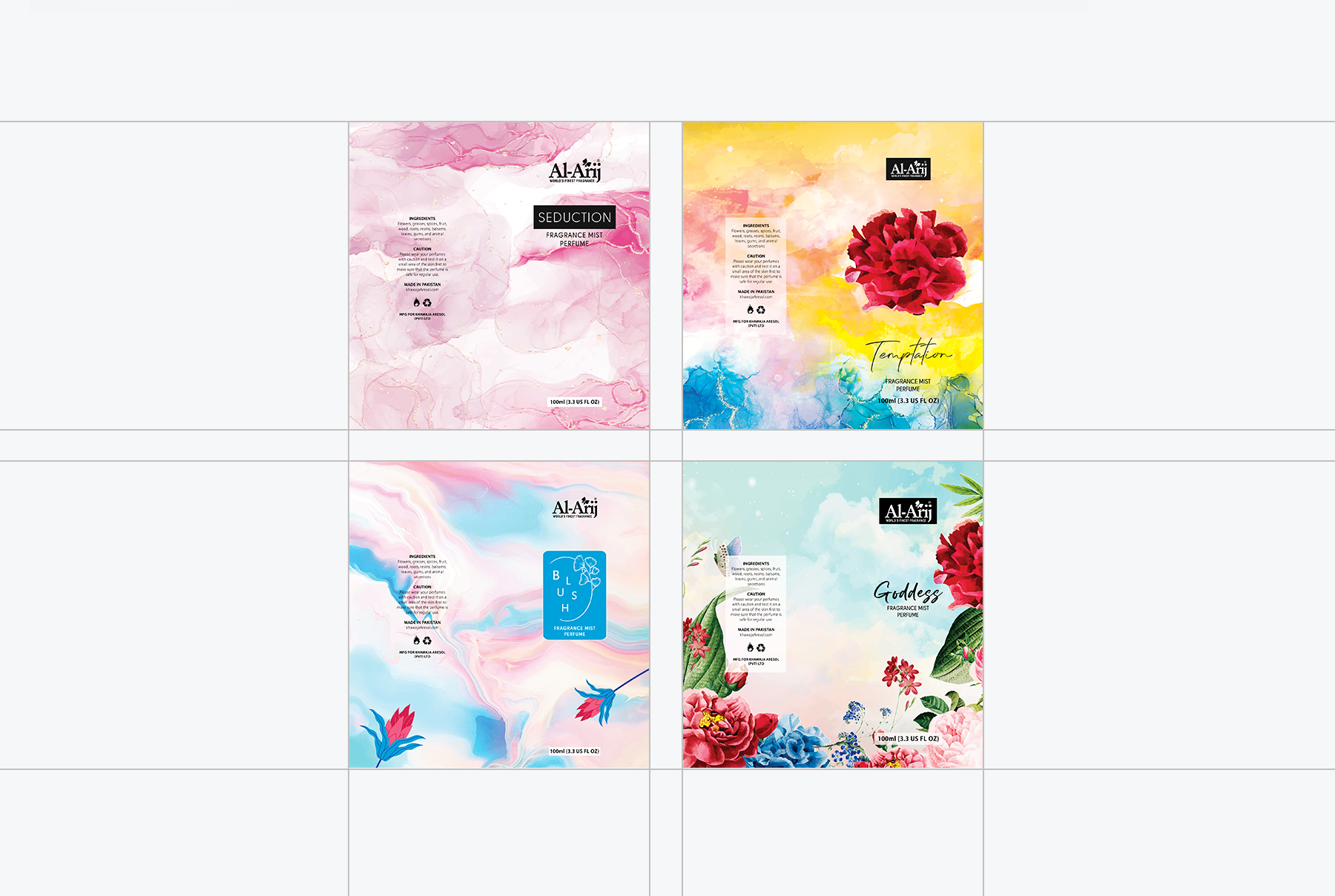 Al Arij is a leading Dubai based perfumery brand which launched a series of body mists for women with an outreach of millions. Al Arij believes in providing affordable high quality body mists with naturally sourced ingredients and sanitizers to the Emirati and Pakistani marketplace. Al-Arij is brand that believes that everyone should smell lovely. NoonFay was asked to make labels for their new range of body mists reflecting the character of the scents. ‘Seduction’ is a mellow floral scent which is reflected in its dreamy label. It has hints of Lavender and orchids contrasted with base notes of musk and is meant to gently appeal and attract. ‘Blush’ contained notes of rose, orris, woody and aqueous. The design reflects the dominant rose and aqueous in its colour scheme and silhouette and is a slightly bolder scent. ‘Temptation’ uses Dahlias as their main scent as visible in the design with notes of Patchouli and aqueous. Aqueous is symbolized in the blue tones at the bottom. ‘Temptation’ makes a statement, deliberately teasing the senses of all who step in its vicinity. ‘Goddess’ uses notes of Dahlias, orchids and Lilly of the valley as shown on the packaging. The sky background symbolizes the scent of a feild of flowers under the vastness of the sky. It gives the freedom and empowerment of smelling gorgeous!